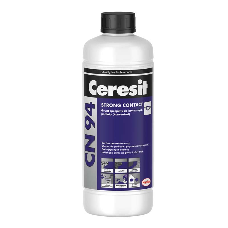 CERESIT® CN 94 je napravljen je za osnovno premazivanje podloga u unutrašnjim i spoljašnjim prostorima pre postavljanja samonivelišućih masa, reparacionih masa, lepkova za keramičke i kamene pločice. Formulacija se posebno preporučuje za kritične podloge kao što su: keramičke pločice, disperzijski i epoksidni premazi. Proizvod jača površinu podloge i poboljšava prianjanje za podlogu. Može se naneti na anhidridne, cementne i mastik asfaltne estrihe, beton, obojene i nebojene drvene podloge, itd. Dostupno pakovanje: Boca od 1 l