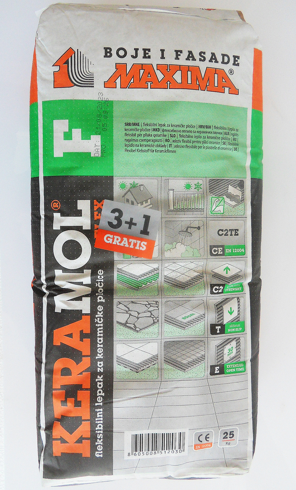 KERAMOL Flex od 25 kg dodati na 7 L vode i mešati do stvaranja homogene mase bez grudvica. Sačekati 15 minuta, pa ponovo intenzivno izmešati. Ovako pripremljena masa spremna je za ugradnju i mora se utrošiti u roku od 2 sata. Površine na koje se nanosi lepak, moraju biti nosivo sposobne, očišćene od prašine, masti i drugih nečistoća. Veće neravnine ispuniti KERAMOL Flex lepkom i to dan pre ugradnje pločica. Pre nanošenja lepka površine grundirati odgovarajućom MAXIKRIL podlogom, u zavisnosti od stanja površine. Ako se lepi “pločica na pločicu” površine grundirati MAXIKRIL Ceramic prajmerom. Nanošenje lepka vršiti nazubljenim gleterom, tako da pri unutrašnjim radovima min. 65% površine pločice bude prekriveno lepkom, dok za spoljašnje radove na celu površinu keramičke pločice treba naneti lepak. Pločice postavljati na naneseni lepak pomerajući ih levo-desno, gore-dole. Praznine između pločica min. 24 sata nakon ugradnje ispunuti FUGALIN masom za fugovanje. Nakon postavljanja pločice i alat odmah oprati vodom.