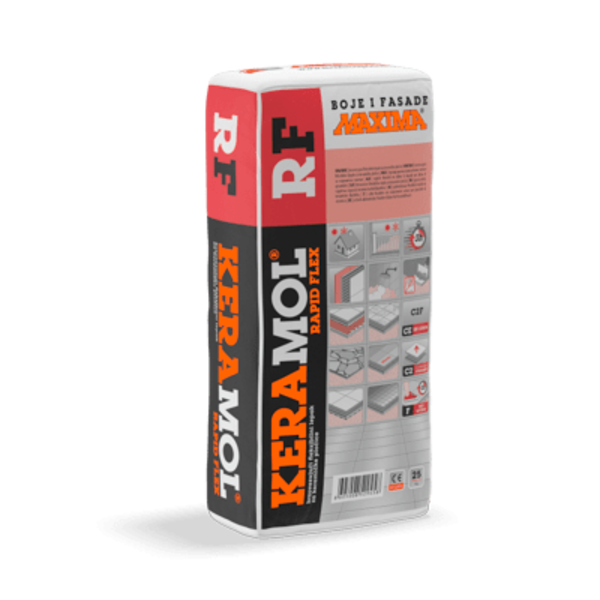 KERAMOL Rapid Flex od 25 kg dodati na 6–6,25 L vode i mešati do stvaranja homogene mase bez grudvica. Sačekati 10 minuta, pa ponovo intenzivno izmešati. Ovako pripremljena masa spremna je za ugradnju i mora se utrošiti u roku od 50 minuta. Površine na koje se nanosi lepak, moraju biti suve, nosivo sposobne, očišćene od prašine, masti i drugih nečistoća. Betoni, cementne košuljice i malteri na bazi cementa, moraju biti najmanje 28 dana stari i sa sadržajem vlage do 2,5%. Veće neravnine ispuniti KERAMOL Flex lepkom i to dan pre ugradnje pločica. Pre nanošenja lepka površine grundirati odgovarajućom MAXIKRIL podlogom, u zavisnosti od stanja površine. Nanošenje lepka vršiti nazubljenom gletericom. Na celu površinu keramičke pločice ili kamena, treba naneti lepak, bilo da se radi o unutrašnjim ili spoljašnjim radovima. Praznine između pločica, minimalno 3 sata nakon ugradnje ispunuti FUGALIN masom za fugovanje. Nakon postavljanja pločice, alat odmah oprati vodom.